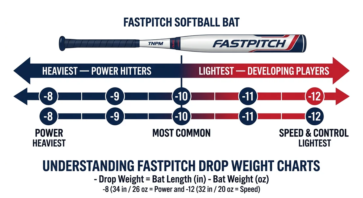 Unlike BBCOR baseball (where -3 is mandatory for high school and college), fastpitch has no universal drop weight requirement. Most leagues allow any drop. The right drop for you comes down to your age, strength, and hitting profile — not the rules.